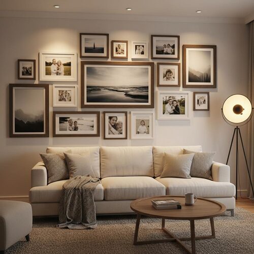 예를 들어, 벽 한쪽에 여러 사진을 모아서 갤러리 월을 만드는 거예요. 다양한 크기의 사진을 사용하되, 색감이나 주제가 비슷하면 훨씬 조화롭습니다. 이 갤러리 월은 거실이나 복도 같은 공간에 두면 자연스레 시선을 끌면서도 공간에 깊이를 더합니다.
